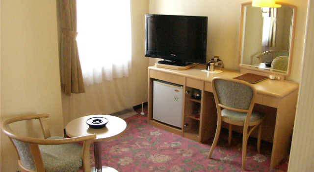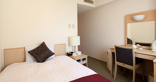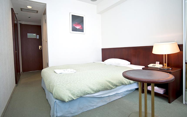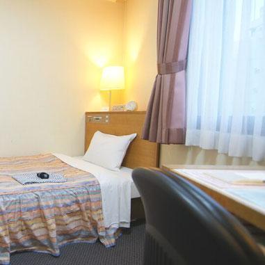 広さ12㎡で幅100cmのシングルベッド1台を備えたお部屋です。シモンズ社製マットを使用しています。無料Wi-Fi、冷蔵庫、シャワートイレ、ドライヤーに加え、ミニキッチン、電子レンジを完備し、長期滞在にも最適です。