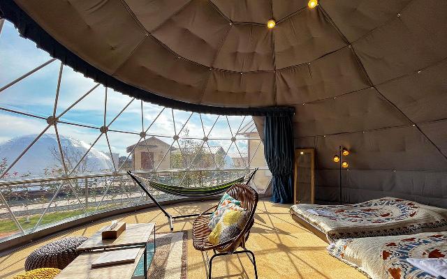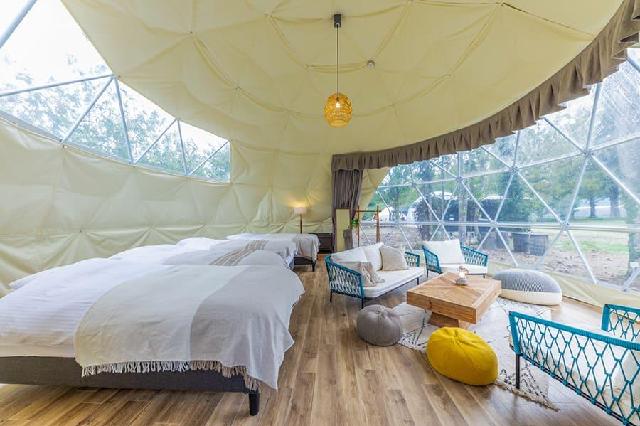 滋賀県高島市マキノ町の年間13万人が訪れる 観光名所、メタセコイア並木沿いに位置する 「GLAMPING MUKU(グランピング ムク)」 一斉に芽吹く新緑が爽やかな春、 青空に映える深緑が美しい夏、 真っ赤に色付く木々の紅葉に魅了される秋 、雪景色や裸樹の風景が幻想的な冬、 四季ごとに表情を変える メタセコイア並木を借景とする、 2基のドーム型テントとトレーラーハウス、 愛犬と泊まれるドッグドームの 計4棟のグランピング。 木々の木漏れ日、満点の星空、澄んだ空気。 自然と調和するグランピングで、 無垢な自分と再会するひとときを。