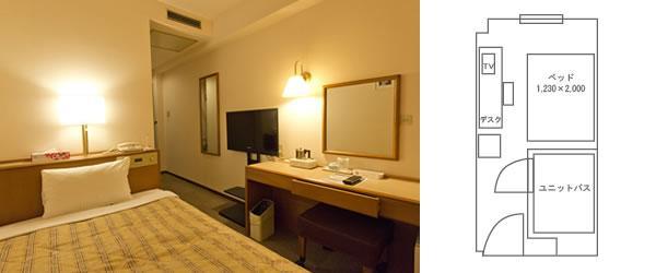 シングルルームはセミダブルベッド採用のゆったりした客室で長期滞在にも快適なビジネスホテル。Wi-Fi接続無料。