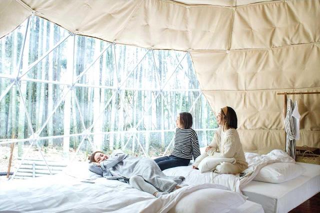 東京から車でアクアラインでわずか約1時間。水と緑の美しい景色が広がる千葉県君津市の厳選かけ流しの温泉宿「亀山温泉ホテル」の敷地内に1棟限定でドームテントを新設致します。 千葉県君津市初となる宿泊滞在可能なドームテントは直径6mの大空間が広がり、2重構造の室内はエアコンを完備。夏はもちろん冬でもオールシーズン快適にお過ごしいただけます。