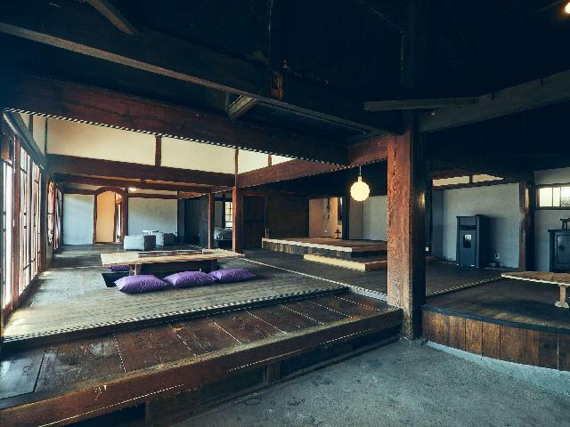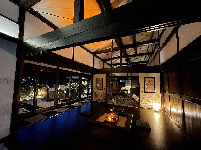 八ヶ岳FUJIYAMAテラスは、明治時代の古民家を改築した大きな一軒家です。 昔ながらの梁(はり)などは生かしつつも、快適さをしっかり追求し、床暖房・システムキッチン・トイレ・バスルームはすべて新設しました。冬もポカポカです。ガラス張りの大きなお風呂は、一度に10人で入浴できて、スチームサウナもあります。サウナの後は、併設の専用ウッドテラスで、星空を眺めながら贅沢にクールダウンしてください。 建物は平屋で、30畳のリビングと、8畳以上のお部屋が5つあり、最大24人でお泊まりいただけます。間接照明の優しい灯りの中、囲炉裏を囲んで(電気式で安全です)、のびのびと団らんをお楽しみください。また、フローリングのリビングでのみ、ペットと一緒にお過ごしいただけます。