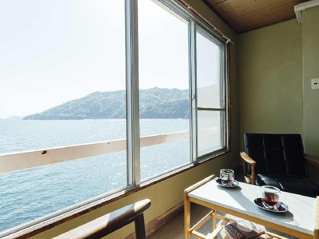 倉橋島桂ヶ浜ビーチのそばにある旅館シーサイド桂ヶ浜荘。広島県呉市倉橋町576-7 電話0823-53-0231 昭和47年(1972年)創業。窓の外に広がる瀬戸内の風景はその当時から変わらぬ美しさです。