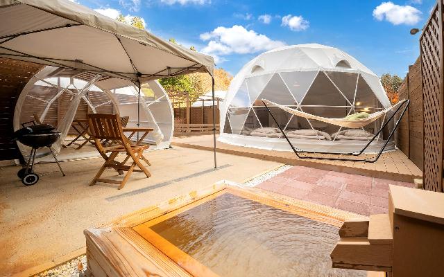 都心から約2時間の自然豊かな栃木県矢板市に、 個別で豊富な天然温泉をかけ流しで楽しめる 露天風呂を備えたグランピング施設