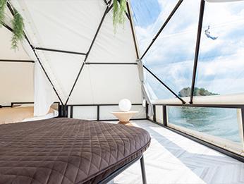 快適にアウトドア滞在を過ごせる ドーム型テントを設置、 夕食には地元の幸をふんだんに盛り込んだBBQで、