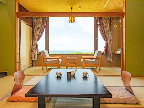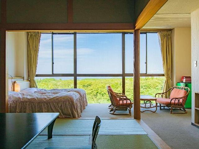 眺望に富んだ客室から男鹿の四季の景色を観賞 客室は開口が海側に面しており、晴れた日には遠く青森との県境に位置する世界遺産「白神山地」まで望む事ができます。広々とした眺望を心ゆくまでご堪能ください。