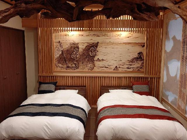 窓から白神の風景を望むお部屋は、ゆったりとした造り。 お客様が快適におやすみになれるよう、 シンプルでありながら上質な空間をめざしました。 お風呂のあとの心地よさをそのままに、いつしか深い眠りへ……。 静かに過ぎる、やすらぎの時間をお楽しみください。 客室は、和室、バリアフリーの和洋室など、全4タイプ。 こだわりの寝具とインテリアで、お客様をお迎えします。