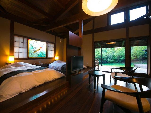 大分県竹田市久住にある全室スイートルームのリゾートホテル「フリューゲル久住」です。全10棟の離れのお部屋は全て露天風呂付き。久住高原の美しい自然、満天の星のもと炭酸水素塩泉の良質なお湯をご堪能頂けます。