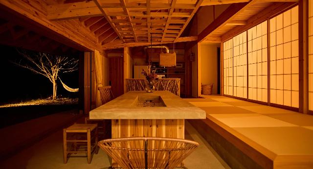 星空の丘に佇む築130年の古民家をリノベーションした宿 ここはとてもアクセスしづらく、ホテルのようなサービスはありません 大切な方と大自然の中、ゆったりとお過ごしいただけます 庭のファイヤーピット囲んで、星空を眺める。 バスルームでは木の温もりに癒されリフレッシュ。 床が一段低くなっているリビングから、日の出を眺める。