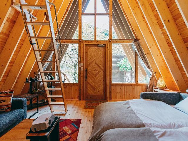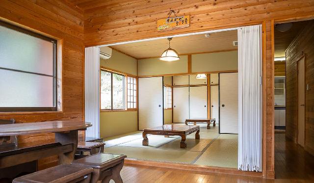 緑に覆われた敷地内に建つ木造のコテージです。同様のものが2棟あります。 各棟、個別のウッドデッキ(屋根付き)があり、備え付けのバーベキューコンロにて、雨天でもBBQをお楽しみいただけます。 また、エアコン・テレビはもちろん、フリーwifiも完備し、SNSやyoutubeを安心してご利用いただけるほか、IHコンロを備えたキッチンでは、持ち込んだ食材を本格的に調理していただくことも可能です。 トイレは水洗ウォシュレット付き、浴室は追い炊き機能を搭載したシステムバスとなっており、快適な一夜をお過ごしいただけます。