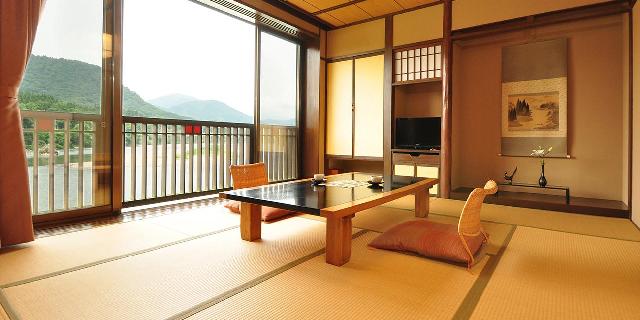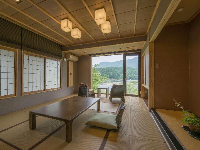 新潟県東蒲原郡阿賀町の麒麟(きりん)山温泉の木造の純和風旅館。すべての部屋から阿賀野川の絶景が楽しめる。地元食材と日本海の幸を使った奥阿賀料理を美しいモミジを眺めるレストランにて。春に咲く雪椿と桜の庭園が自慢。